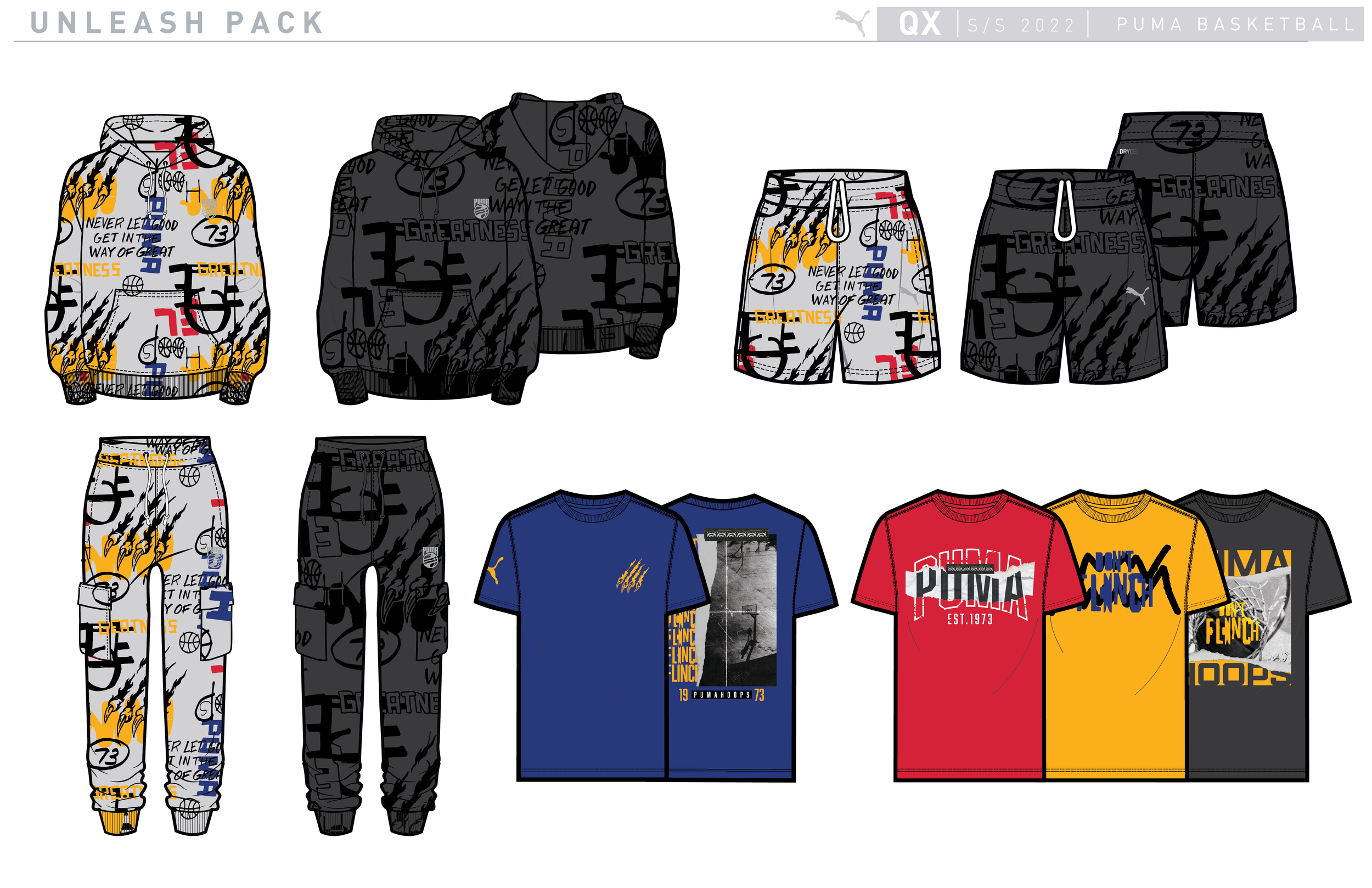 Graphic driven apparel pack centered around court rider footwear hook. Inspiration looks at breaking down what a “Slash” is graphically through paper tears, gritty illustration, collage and typography with overlaying elements